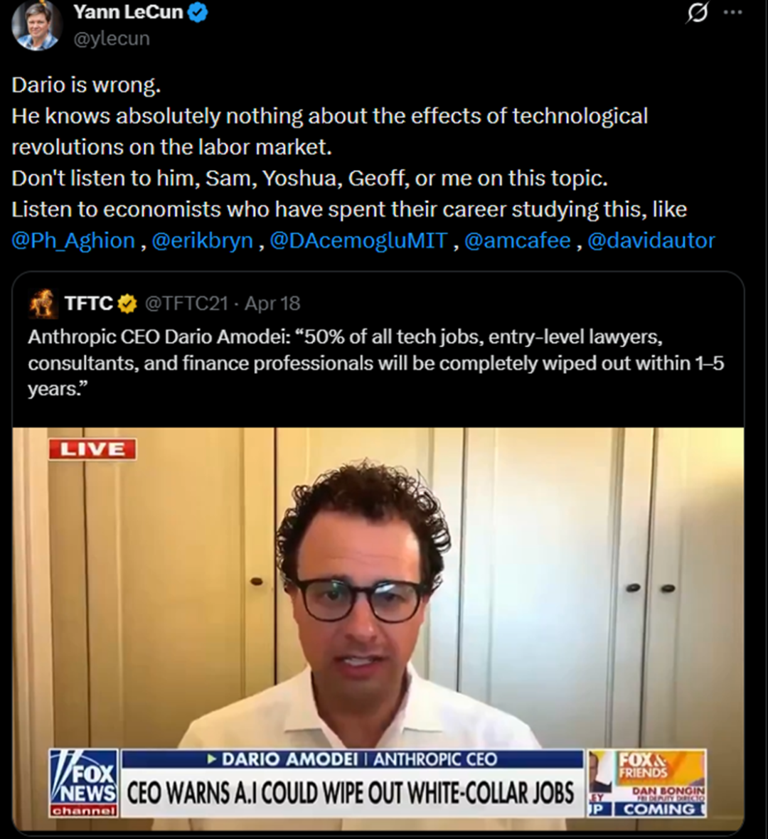 对此,图灵奖获得者杨立昆又出来驳斥:Dario(Amodei)错了,在技术革命如何影响劳动就业市场这一问题上,他一窍不通。在这一问题上,千万别听他的话,别听Sam (Altman)、Yoshua (Bengio)、Geoff (Hinton)的话,也别听我的话,听经济学家的。
