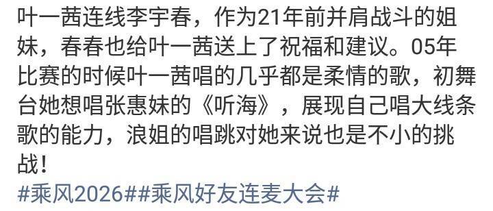 “乘风好友连麦大会”也就感动你我他!要知道,连麦的双方都是引人关注的!一方面,连麦的这一方,是参加《乘风2026》初舞台的选手!这些选手,期待把握好初舞台演出的机会,从而带来一个美好的结果!另一方面,连麦的那一方,是演艺圈内的知名艺人,她们的知名度高,演出经验丰富。有“师者传道受业解惑”的助力作用!