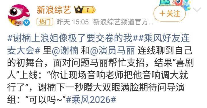 清晰可见的是,谢楠连麦马丽!在屏幕面前,谢楠和马丽互相问声好。这是礼貌,也是尊重,更是敬意!即将参加《乘风2026》的谢楠,对自己充满期待!谢楠向马丽帮忙支招!马丽的回复温馨感人!“你让现场音响老师把他音响调大就行了”。