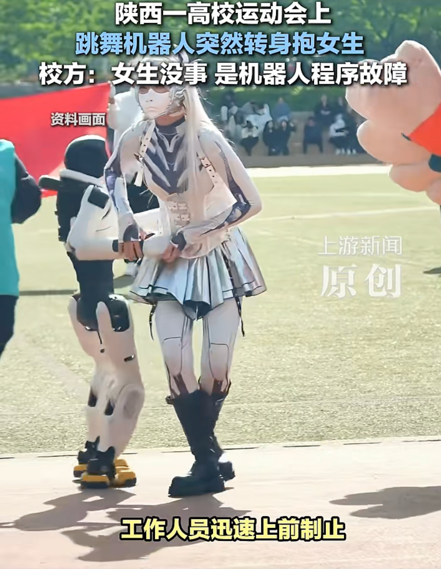 那这种“搞错”是否属于程序故障?该工作人员表示:“对对对。”他还说明,当时机器人在舞蹈中转头将女生抱住了,现场工作人员立即上前将两者分开。