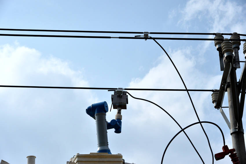 机器人带着引流线向供电线路接线处靠近。贾理要摄
