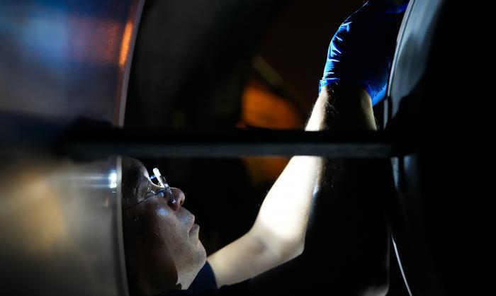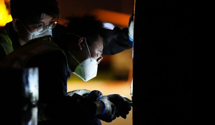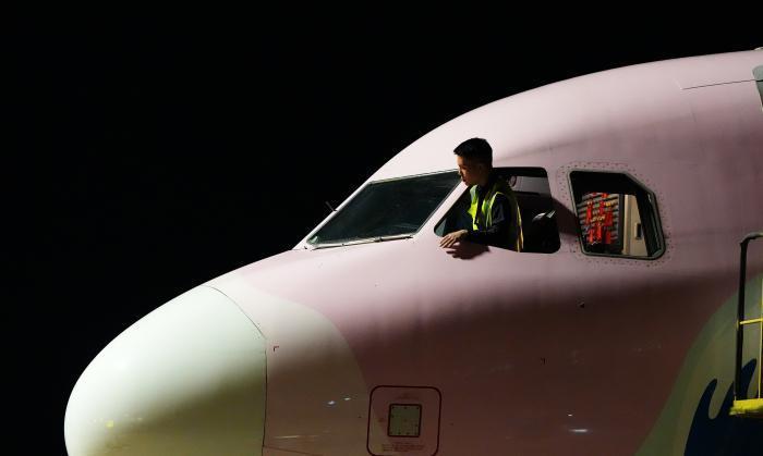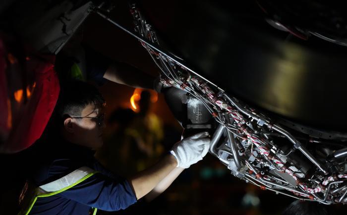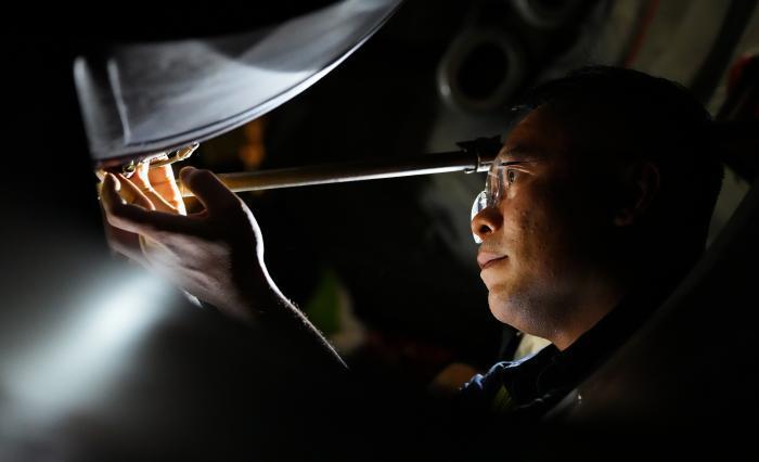 在海口美兰国际机场停机坪上,南航工程技术分公司机务工程师对“消博号”彩绘飞机进行深度检查(4月4日摄)。