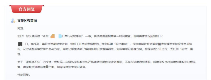 针对这一情况,零陵区教育局和涉事学校回复称:学校按照学期教学计划,组织了开学后学情检测,并非所谓“秘密考试”。该检测旨在帮助教师精准掌握学生阶段性学习情况,及时调整后续教学节奏与方法,同时让学生清晰了解自身知识掌握薄弱点,为后续学习明确方向,全程依规公开进行,无任何“秘密”属性。