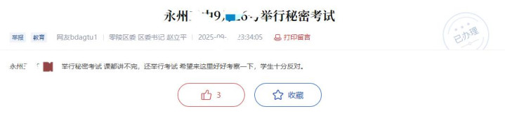 近日,有湖南永州的网友在问政平台上反映,学校在课都未讲完的情况下,举行秘密考试,学生们十分反对,希望有关部门能够管一管。
