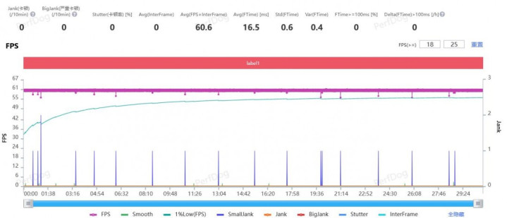 在实际游戏测试中,Mate X7典藏版的表现令人印象深刻。在《原神》极高渲染精度、高特效和细节的条件下进行半小时测试,平均帧数达到59.9帧,帧数曲线平直,整个游戏体验流畅。