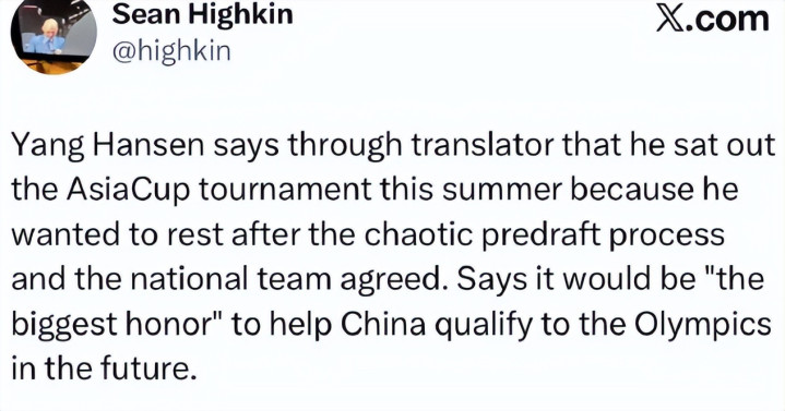 此前杨瀚森在开拓者新赛季媒体日接受采访时,表示:“未来若能帮助中国男篮重返奥运会,将会是他的最大荣誉。”